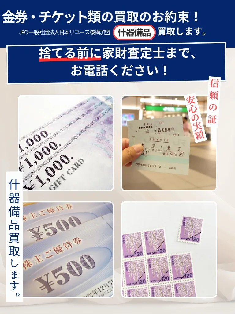遺品整理や生前整理、書斎の片付けなどで出てきた金券・チケット類もまとめて査定・買取いたします。ご遺族のお気持ちに寄り添い、故人様が大切にされてきたお品物の価値をしっかりと見極めます。他の不用品回収も同時に行えます。